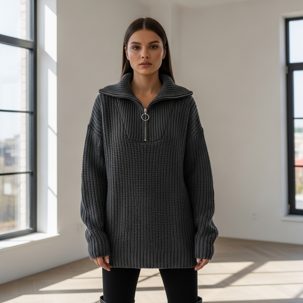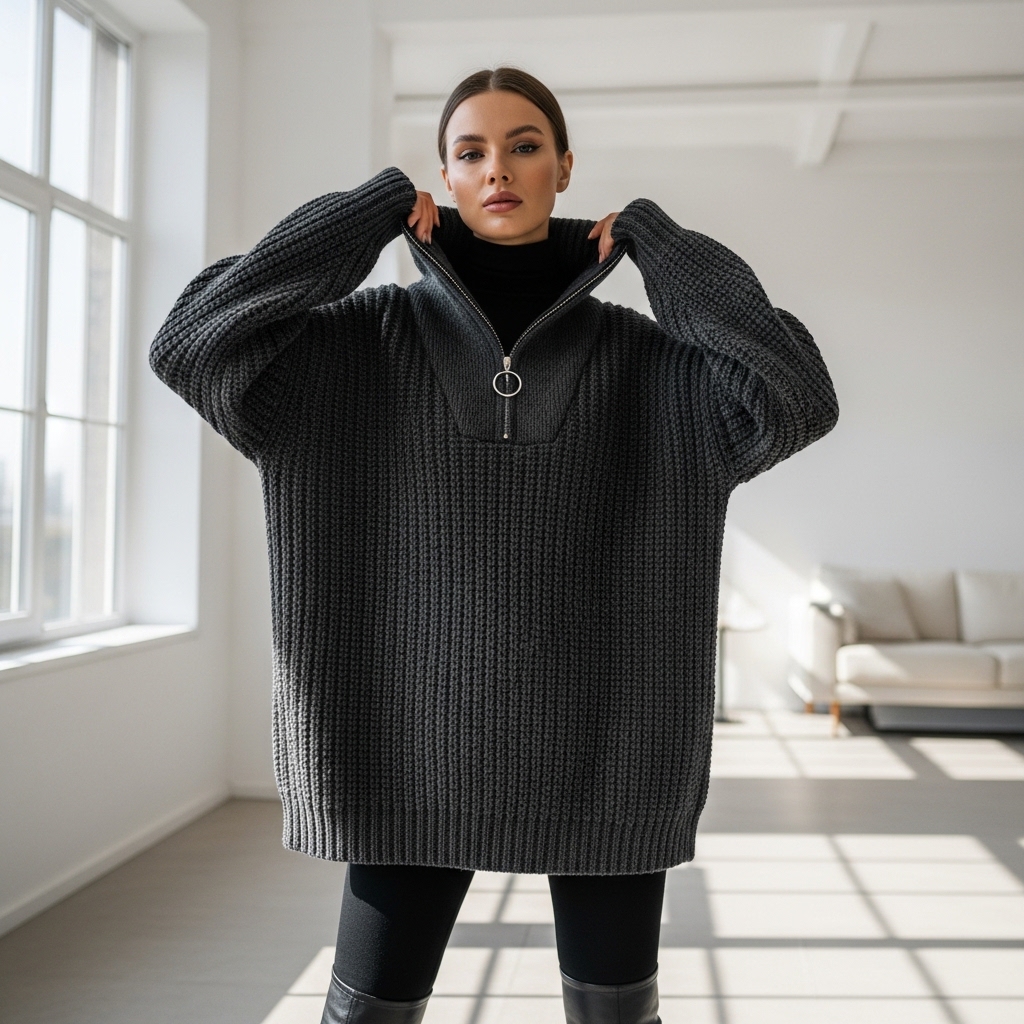 Tasarım Detayları: Gümüş renkli metal fermuar detayı, kazağa endüstriyel ve modern bir hava katar. Düşük omuz (drop shoulder) ve geniş kol kesimi, oversize (geniş kalıp) trendini destekler. Bel ve kol manşetlerindeki sıkı dokuma, kazağın formunu uzun süre korumasını sağlar.