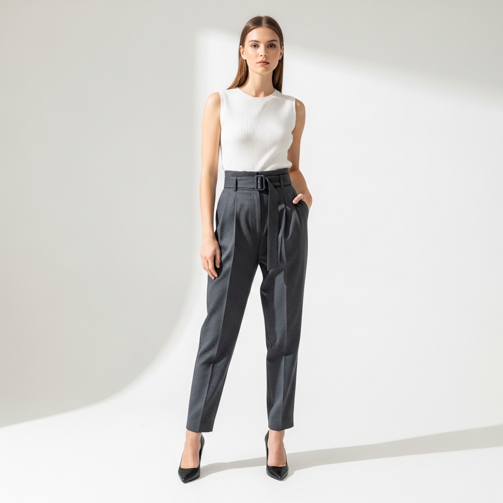 Tasarım Detayları: Yüksek bel bandı, gizli kanca ve fermuar kapama ile temiz bir ön görünüm sunar. Yanlarda derin fonksiyonel cepler, arkada ise estetik amaçlı sahte fileto cepler bulunur. Kendi kumaşından hazırlanan çıkarılabilir kemeri, beli vurgulamak için idealdir.