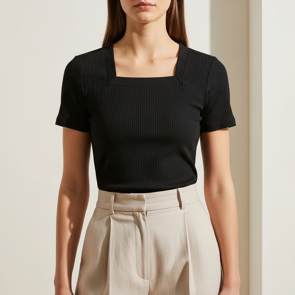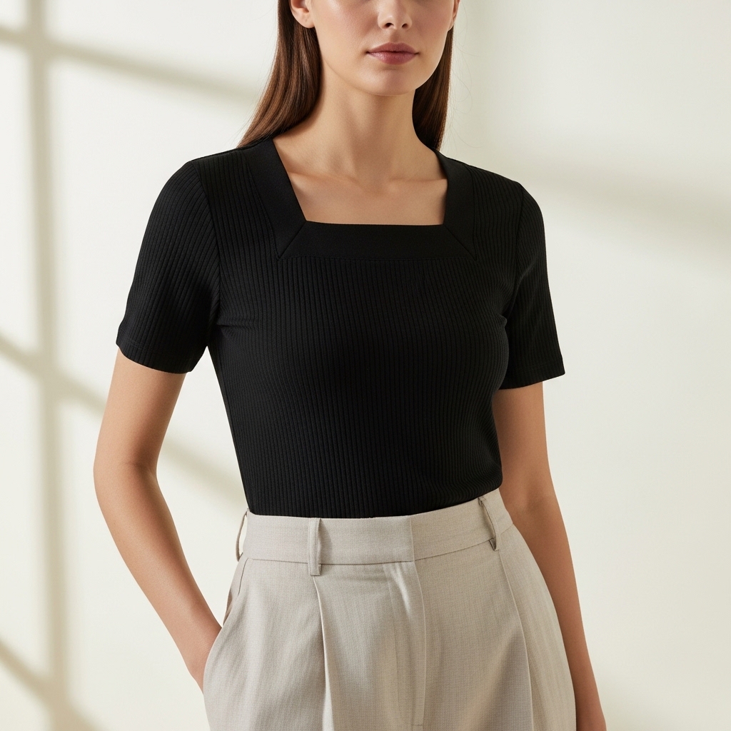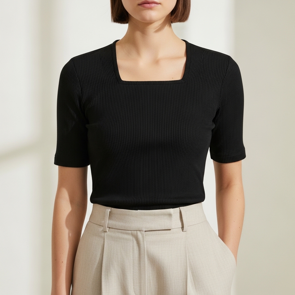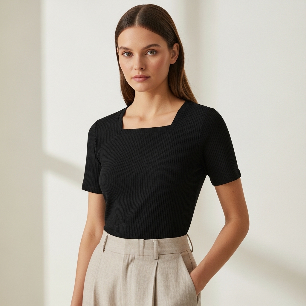 Selena Serisi, minimalizmi feminen detaylarla birleştirmek için tasarlandı. Özel "Ribana" örgü tekniği ile üretilen bu tişört, dikey çizgili dokusu sayesinde silüetinizi daha ince ve uzun gösterir. Kare yaka (square neck) tasarımı, köprücük kemiklerini ön plana çıkararak dekolte bölgesine modern ve geometrik bir zarafet katar.
